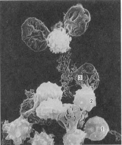 Рис 15. Электронная микрофотография гемолиза эритроцитов и образование их “теней” В макрофагах НЬ распадается на пигмент билирубин и гемосидерин - аморфные агрегаты, содержащие железо. Железо гемосидерина связывается с трансферрином - негеминовым белком плазмы, содержащим железо, и захватывается специальными макрофагами костного мозга. В процессе образования эритроцитов (эритропоэз) эти макрофаги передают трансферрин в формирующиеся эритроциты, что послужило основанием назвать их клетками-кормилками. В цитоплазме эритроцитов содержатся ферменты анаэробного гликолиза, с помощью которых синтезируются АТФ и НАДН, обеспечивающие энергией главные процессы, связанные с переносом О2 и СО2 , а также поддержание осмотического давления и перенос ионов через плазмолемму эритроцита. Энергия гликолиза обеспечивает активный транспорт катионов через плазмолемму, поддержание оптимального соотношения концентрации К+ и Na+ в эритроцитах и плазме крови, сохранении формы и целостности мембраны эритроцита. НАДН участвует в метаболизме НЬ, предотвращая окисление его в метгемоглобин. Эритроциты участвуют в транспорте аминокислот и полипептидов, регулируют их концентрацию в плазме крови, т.е. выполняют роль буферной системы. Постоянство концентрации аминокислот и полипептидов в плазме крови поддерживается с помощью эритроцитов, которые адсорбируют их избыток из плазмы, а затем отдают различным тканям и органам. Таким образом, эритроциты являются подвижным депо аминокислот и полипептидов. Сорбционная способность эритроцитов связана с состоянием газового режима (парциальное давление О2 и СО2 - Ро, Рсо): в частности, при действии О2 наблюдаются выход аминокислот из эритроцитов и увеличение их содержания в плазме. 2.3.2 Тромбоциты\кровяные пластинкиМелкие дисковидные двояковыпуклые безъядерные постклеточные структуры диаметром 2-4 мкм, циркулирующие в крови. Они образуются в красном костном мозге в результате фрагментации участков цитоплазмы мегакариоцитов (гигантских клеток костного мозга), поступают в кровь, в которой находятся в течение 5-10 дней, после чего фагоцитируются макрофагами, преимущественно в селезенке и легком. Часть тромбоцитов разрушается за пределами сосудистого русла, куда они попадают при повреждении стенки сосудов. Общее количество тромбоцитов в крови взрослого человека 0,8-2,4 *1012 ; из этого числа около 15 % обновляются ежедневно. В норме в крови циркулирует 2/3 общего числа тромбоцитов, а 1/3 находится вне циркуляции в красной пульпе селезенки. На мазках крови тромбоциты вследствие агрегации обычно выявляются в виде скоплений. Концентрация тромбоцитов в крови равна 200-400 тыс. /мкл (200-400 *109 /л) крови. Функции тромбоцитов осуществляются как внутри сосудистого русла, так и вне его. К ним относятся: 1) Остановка кровотечения при повреждении стенки сосудов (первичный гомеостаз) - основная функция тромбоцитов; 2) Обеспечение свертывания крови - (гемокоакуляция) - вторичный гомеостаз (совместно с эндотелием кровеносных сосудов и плазмой крови); 3) Участие в реакциях заживления ран (в первую очередь, повреждений сосудистой стенки) и воспаления; 4) Обеспечение нормальной функции сосудов, в частности, их эндотелиальной выстилки (ангиотрофическая функция). Строение тромбоцитов. Тромбоцит окружен плазмолеммой и включает 1. светлую про