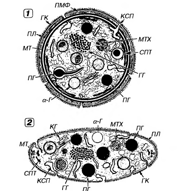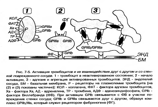 Рис.16. Ультраструктура тромбоцита.1 - сечение в экваториальной плоскости, 2 - поперечный разрез, ПЛ - плазмолемма, ГК - гликокалис, КСП - канальцы, связанные с поверхностью, СПТ - система плотных трубочек, МТ - микротрубочки, ПМФ - подмембранные микрофиламенты, ГГ - гликоген, КГ - комплекс Гольджи, МТХ - митохондрия, α-Г - α-гранулы, ПГ - плотные гранулы. 4. Плазмолемма тромбоцитов покрыта снаружи толстым (от 50 до 150-200 нм) слоем гликокалиса с высоким содержанием гликозаминогликанов и гликопротеинов (см. рисунок 17). 5. Она содержит многочисленные рецепторы, посредующие действие веществ, активирующих и ингибирующих функции тромбоцитов, обуславливающие их прикрепление (адгезию) к эндотелию сосудов и агрегацию (склеивание друг с другом). 6. Наиболее важными из них в функциональном отношении являются рецепторные гликопротеины Ib (GP Ib), IIb (GP IIb), IIIa (GP IIIa), рецепторы к АДФ, адреналину, тромбину, фактору Ха, фактору агрегации тромбоцитов (ФАТ), коллагену.
