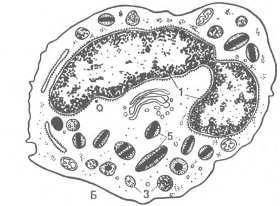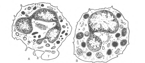 Рис.3. Нейтрофильный гранулоцит Цитоплазма нейтрофилов при окраске по Романовскому - Гимзе окрашивается слабооксифильно, в ней видна очень мелкая зернистость розово-фиолетового цвета (окрашивается кислыми и основными красками), поэтому называется нейгрофильной или гетерофильной. В поверхностном слое цитоплазмы зернистость и органеллы отсутствуют. Здесь расположены гранулы гликогена, актиновые филаменты и микротрубочки, обеспечивающие образование псевдоподий для движения клетки. Сокращение актиновых филаментов обеспечивает передвижение клетки по соединительной ткани. Во внутренней части цитоплазмы расположены органеллы (аппарат Гольджи, гранулярный эндоплазматический ретикулум, единичные митохондрии), видна зернистость. Число зерен в каждом нейтрофиле варьирует и составляет 50-200. В нейтрофилах можно различить два типа гранул: специфические и азурофильные, окруженные одинарной мембраной. Специфические гранулы, более светлые, мелкие и многочисленные, составляют 80-90 % всех гранул. Их размер около 0,2 мкм, они электронно-прозрачны, но могут содержать кристаллоид; содержат бактериостатические и бактерицидные вещества - лизоцим (муромидаза) и щелочную фосфатазу, а также белок лактоферрин. Лактоферрин связывает ионы железа, что способствует склеиванию бактерий (бактериальная мультипликация). Он также инициирует отрицательную обратную связь, обеспечивая торможение продукции нейтрофилов в костном мозге. Азурофильные гранулы более крупные (~ 0,4 мкм), окрашиваются в фиолетово-красный цвет; их количество составляет 10-20 % всей популяции гранул. Они являются первичными лизосомами, имеют электронно-плотную сердцевину, содержат лизосомальные ферменты (кислая фосфатаза, р-глюкуронидаза и др.) и миелопероксидазу. Миелопероксидаза из перекиси водорода продуцирует молекулярный кислород, обладающий бактерицидным действием. Азурофильные гранулы в процессе дифференцировки нейтрофилов в костном мозге появляются раньше, поэтому называются первичными в отличие от вторичных - специфических. Основная функция нейтрофилов - фагоцитоз микроорганизмов, поэтому их называют микрофагами. В процессе фагоцитоза бактерий сначала (в течение 0,5-1 мин) с образующейся фагосомой (захваченная бактерия) сливаются специфические гранулы, ферменты которой убивают бактерию, при этом образуется комплекс, состоящий из фагосомы и специфической гранулы. Позднее с этим комплексом сливается лизосома, гидролитические ферменты которой переваривают микроорганизмы. В очаге воспаления убитые бактерии и погибшие нейтрофилы образуют гной. Фагоцитоз усиливается при опсонизации с помощью иммуноглобулинов (Ig) или комплемента плазмы. Это так называемый рецепторопосредованный фагоцитоз. Если у человека имеются антитела IgG для конкретного вида бактерий, то бактерия обволакивается этим специфическим IgG, имеющим специальную область Fc, которая распознается Fc-рецептором на плазмолемме нейтрофила и присоединяется к нему. Образующееся соединение [IgG - Fc-рецептор] на поверхности нейтрофила запускает фагоцитоз. В популяции нейтрофилов здоровых людей в возрасте 18-45 лет фагоцитирующие клетки составляют 69-99 %. Этот показатель называют фагоцитарной активностью. Фагоцитарный индекс - другой показатель, которым оценивается число частиц, поглощенных одной клеткой. Для не