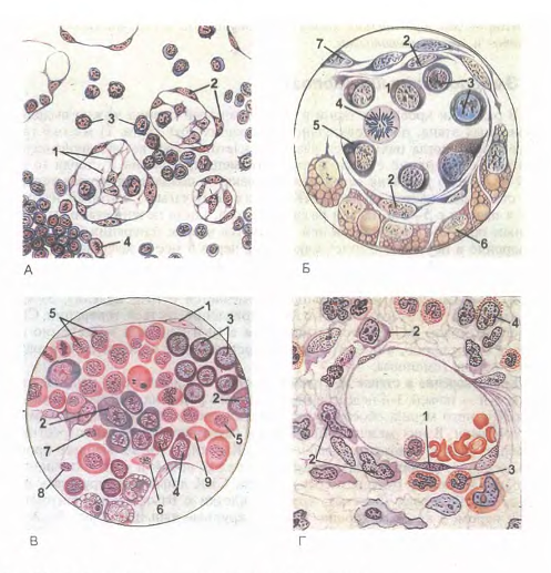 Рис. 19. Ультрамикроскопическое строение гранулоцитов (схема по НА. Юриной и Л.С. Румянцевой). А - сегментоядерный нейтрофильный гранулоцит; Б – эозинофильный (ацидофильный) гранулоиит; В - базофильный фанулоцит: 1 - сегменты ядра; 2 - тельце полового хроматина; 3 – первичные (азурофильные) гранулоциты; 4 - вторичные (специфические) гранулы; 5 - зрелые специфические гранулы эозинофила, содержащие кристаллоиды; б - гранулы базофила различной величины и плотности; 7 - периферическая зона, не содержащая органелл; 8 – микроворсинки и псевдоподии. Рис. 20. Эмбриональный гемоппэп (по А.А. Максимову). А - кроветворение в стенке желточного мешка зародыша морской свинки: 1 - меэенхималыгые клетки; 2 - эндотелий стенки сосудов; 3 - первичные кровяные клетки-бласты; 4 - митотическос деление бластов; Б - поперечный срез кровяного островка зародыша кролика S'/j сут: I - полость сосуда; 2 - эндотелий; 3 - интраваскулярные кровяные клетки; 4 - делящаяся кровяная клетка; 5 - формирование первичной кровяной клетки; 6 - энтодерма; 7 - висцеральный листок мезодермы. В - развитие вторичны); эритробластов в сосуде зародыша кролика 13'Д сут: 1 - эндотелий; 2 - проэритробласты; 3 - базофильные эритробласты; 4 - полихроматофильные эритробласты; 5 - оксифильные эритробласты (нормобласты); 6 - оксифильный эритробласт с пикнотическим ядром; 7 - обособление ядра от оксифильного эритробласта (нормобласта); 8 - вытолкнутое ядро нормобласта; 9 - вторичный эритроцит. Г - кроветворение в костном мозге зародыша человека с длиной тела 77 мм. Экстра во скул я рное развитие клеток крови: 1 - эндотелий сосуда; 2 - бласты; 3 - нейтрофильные гранулоциты; 4 - эоэинофильный миелоцит.