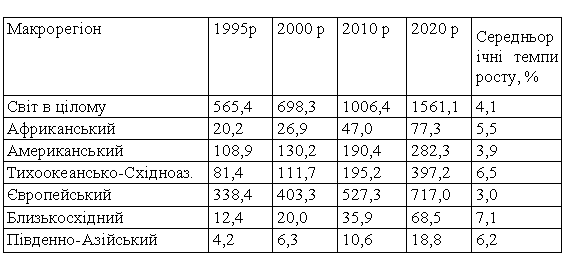 Європейський та Американський макрорегіони є і надалі залишаться найпривабливішими для туристів. У 2008 р. обсяги аквізицій до Європи становили 58%, а до Америки – 19% від загального обсягу міжнародного туризму, хоча у цих регіонах відмічається падіння темпів приросту, особливо у Європі та Північній Америці, в той час, як у Центральній та Південній Америці, навпаки, спостерігається значне зростання туристичних прибуттів, особливо в районі Карибського басейну. Високими темпами зростання міжнародного туризму характеризується Тихооокеансько-Східноазійський макрорегіон, на який припадає 16% загальносвітового потоку, що можна пояснити перебудовою внутрішнього ринку країн регіону, значними успіхами у розбудові національних індустрій туризму. У Африканському макрорегіоні останні роки XX ст. позначені значними успіхами міжнародного туризму, зростанням популярності таких країн як Замбія, Зімбабве, Марокко. На Близькому Сході, який, незважаючи на складну політичну ситуація залишається туристично привабливим регіоном, особливо значними є темпи зростання туристичних потоків до Єгипту, частка якого в регіоні становить майже 26%, країн Перської затоки, Сирії. Південно-Азійський макрорегіон в цілому розвивається стабільно, але попит на послуги острівних країн зростає швидше завдяки проведенню ними активної туристичної політики на зовнішніх ринках. Антарктида дедалі більше притягує до себе туристів і, аби не опір ряду громадських організацій, які активно борються проти залучення цього регіону до туристичного процесу, тут можна було б спостерігати найбільші темпи зростання попиту, незважаючи на високі ціни (мал. 2.1). Незважаючи на долання кризових явищ, Всесвітня туристична організація прогнозує подальше зростання туристичного процесу до 2020 р. з щорічними темпами у 4,1%. Враховуючи виявлені тенденції, прогнозується перерозподіл туристичних потоків (таблиця 2.3).