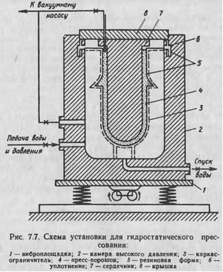 Этот метод основан на всестороннем обжатии засыпанного в эластичную форму пресс-порошка или предварительно оформленной каким-либо другим способом заготовки давлением жидкости или сжатого газа. Изостатическое прессование в резиновых формах путем приложения гидростатического давления жидкости называют гидростатическим прессованием. Этот способ позволяет получать наиболее плотные и однородные заготовки сложной конфигурации. В этом случае равномерные уплотняющие усилия и соответственно равноплотность всех участков прессуемого изделия обеспечиваются всесторонним приложением давления от нагнетаемой жидкости к прессуемому изделию через эластичную резиновую оболочку. При гидростатическом прессовании устраняются потери давления на трение о стенки формы, в результате чего изделия хорошо пропрессовываются и имеют меньшие внутренние напряжения, чем при изготовлении их другими способами. При этом важным условием получения высококачественных плотных заготовок является равномерная укладка гранул пресс-порошка (желательно изометрической конфигурации) в форме и полное удаление воздуха может производиться как предварительное до начала прессования, так и в процессе прессования, например вакуумированием. Гидростатическое прессование в резиновых формах производится для различных материалов в широком интервале давлений жидкости 10—103 МПа. Особенности процесса гидростатического прессования рассмотрим на примере получения заготовок для высоковольтных конденсаторов (рис. 7.7). В решетчатый или сетчатый каркас-ограничитель 3, служащий для крепления формы и придания ей жесткости во время засыпки пресс-порош ком, помещается резиновая форма 5. С помощью крепежного и уплотняющего устройства 6 она прижимается так, чтобы пространство в прессовочной камере вне формы было изолировано от атмосферы. Далее производится откачка воздуха из этого пространства, в результате чего резиновая форма прижимается к каркасу-ограничителю и принимает конфигурацию, соответствующую конфигурации заготовки с учетом коэффициента уплотнения пресс-порошка. После установления в форму сердечника 7, формирующего внутреннюю полость заготовки, производится засыпка пресс-порошка при одновременном воздействии на систему вертикально направленной вибрации. Форма закрывается крышкой 8 с уплотнением 6 и производится вакуумирование ее внутренней части с пресс-порошком. Далее на стадии прессования пространство вне формы отключают от вакуумной системы и его заполняют гидравлической жидкостью Жидкость, давя на форму со всех сторон, обжимает ее, прессуя заключенный в форме пресс-порошок при одновременном его вакуумировании. Удаление технологической связки
