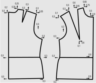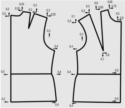 Мал.2. Схема градації по розмірам спинки і полочки сукні Наприклад, надбавка до напівобхвату грудей в 44 і в 54 розмірах буде однакова. В процесі градації рукава ми прагнемо до збереження норми посадки, а не надбавки до ширини рукава, а в деталях спинки і полички просто нехтуємо такими величинами. Як відомо, довжина оката рукава розраховується по формулі: Док=Дпр + Ппос, де Ппос = Дпр*Н. Таким чином, Док=Дпр*(1+Н). Якщо застосувати дану формулу до розрахунку ширини виробу (Ши), узявши за вихідні параметри напівобхват грудей 3 (Сг3) і норму посадки (Н), то для 44 розміру отримуємо: Ши = Сг3*(1+Н)= 44*1.1 = 48.4, Псг3 = 4.4 див. А для 54 розміру отримуємо: Ши = Сг3*(1+Н)= 54*1.1=59.4, Псг3 = 5.4 див. З розрахунків бачимо, що надбавка збільшилася на 1 см за 5 міжрозмірних інтервалів, тобто в кожному інтервалі не хапає 2мм. Таким чином, якщо використовувати для градації запропоновану схему, то до певного розміру виріб перестане відповідати фігурі, а, простіше кажучи, буде мало. Додавши бракуючу величину, отримуємо схему (мал. 3).