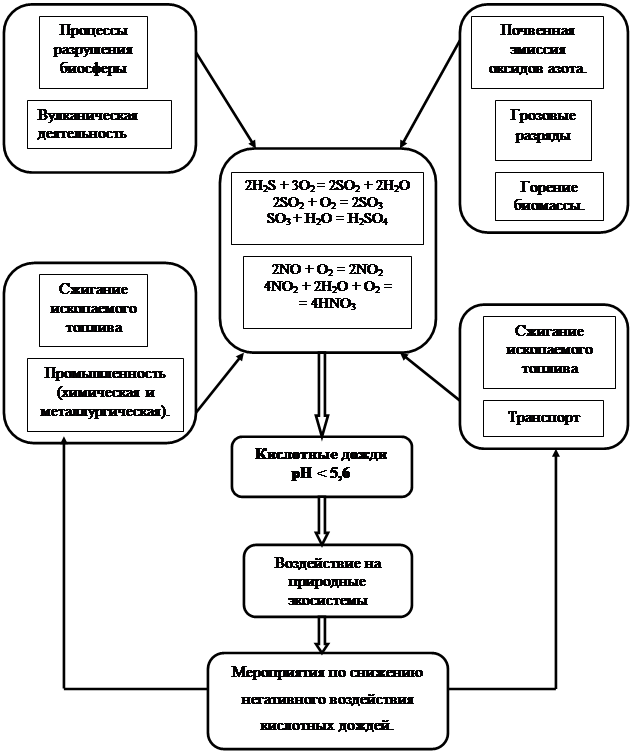 Атмосфера Антропогенные источники соединений серы. Антропогенные источники NOx Рис.1 Блок-схема модели возникновения кислотных дождей в атмосфере. Загрязнение атмосферного воздуха таит в себе угрозу не только здоровью людей, но и наносит большой экономический ущерб. Наличие в воздухе соединений серы ускоряет процессы коррозии металлов, разрушение зданий, сооружений, памятников культуры, ухудшает качество промышленных изделий и материалов. Установлено, например, что в промышленных районах сталь ржавеет в 20 раз, а алюминий разрушается в 100 раз быстрее, чем в сельской местности. Вредные для человека и для природы выбросы могут перемещаться в воздушных потоках на громадные расстояния. Например, установлено, что выбросы промышленных предприятий ФРГ и Великобритании переносятся на расстояния более 1000 км и выпадают на территории скандинавских стран, а из северо-восточных штатов США - на территории Канады. Вредоносные последствия загрязнения среды сказываются и в нашей стране. Так, по данным Европейской экономической комиссии ООН, через российскую границу в воздушных потоках с запада на восток идет в 4 раза больше серы, чем в обратном направлении. Несколько десятилетий назад выражения “кислотные осадки” и “кислотные дожди” были известны лишь исключительно ученым, посвященным в определенных, специализированных областях экологии и химии атмосферы. За последние несколько лет эти выражения стали повседневными, вызывающими беспокойство во многих странах мира. Проблема кислотных дождей стала одной из экологических проблем глобального масштаба. Кислотные осадки являются проблемой, которая в случае ее бесконтрольного развития, может вызвать и уже в некоторых регионах вызывает существенные экономические и социальные издержки. Имитационная модель возникновения кислотных дождей в атмосфере может быть использована для решения этой проблемы. Из этой модели видно, что основной причиной кислотных дождей является антропогенная деятельность. Международный исследовательский институт прикладного системного анализа (IIASA) проводит изучение моделей с целью установления возможной кислотности почв, вод и т.п. через десятки лет. Результаты говорят о том, что почвы и леса в Европе могут быть спасены от дальнейшего закисления только путем значительного сокращения выбросов. Эти выбросы должно самостоятельно регулировать каждое государство. Для уменьшения эмиссии загрязняющих веществ в атмосферу существует ряд способов: - сильное сокращение использования энергии; - ввод новых технологий, установка фильтрующего оборудования; - использование слабозагрязняющих либо совсем незагрязняющих источников энергии. Подобное решение звучит довольно нереально. Ни одно государство не согласится уменьшить масштабы потребления энергии и тем самым ухудшить уровень жизни. Ввод новых технологий и установка фильтрующего оборудования также представляют собой экономическую проблему. Тем не менее, единственным решением проблемы кислотных дождей видится в сокращении потребления энергии, улучшении контроля над выбросами или разработке альтернативных методов производства электроэнергии, иначе мы, несмотря, ни на какие усилия, окажемся на «непригодной для жизни планете». КИСЛОТНЫЕ ДОЖДИ Термином "кислотные дожди" называют все виды метеорологичес