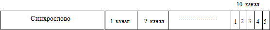 Таким образом выбираем разрядность квантователя: В = 5 разрядов 2.3 Выбор группового сигнала и расчет его параметровНа основании расчетов, приведенных в пункте определение частоты дискретизации, определим длительность интервала времени, в течение которого необходимо передать информацию о текущем отсчете входного сигнала. Выберем синхронный метод передачи с кадровой синхронизацией. Чтобы на приемной стороне мы могли обработать информацию требуется знать момент времени ее появления. Для этого в начале канального сигнала (кадра) размещается так называемый синхросигнал, который отличается от информационного сигнала. Таким образом кадр состоит из двух частей: сигнала синхронизации и информационного сигнала: Тк=Тс+Ти, где Тк - длительность канального сигнала; Тс - длительность синхроимпульса; Ти - длительность информационного сигнала Причем Тк=1/Fo=1/25*103 =4*10-5 сек. = 40 мкс. Имеем 10 каналов, количество элементарных передаваемых символов в каждом канале равно числу уровней квантования В = 5, Т.о. количество элементарных символов в информационном сигнале: Nи = 5*10 = 50. В качестве синхрослова выберем сложный сигнал (составной), в этом случае для уменьшения вероятности ложного срабатывания системы кадровой синхронизации необходимо или выбирать длительность синхросигнала ³ 1/2 Ти или вводить в информационный сигнал запрещенные комбинации, что сильно усложняет аппаратуру. В нашем случае Ти / 2 =12.5, поэтому выберем синхронизацию по кадрам с помощью тринадцатиразрядного кода Баркера. Коды Баркера являются наилучшими в своем классе. АКФ этих кодов имеет узкий центральный пик и минимальный уровень боковых лепестков = 1/N, где N - значность кода. Количество элементарных символов в кадре: N=Nс + Nи = 50 + 13 = 63 (шт.) Длительность элементарного символа: t = Тк / N= 4 0*10-6 / 63 @6.35*10-7 =0.635 мкс. Тактовая частота: fт = 1/t = 1.575*106 Гц =1.6 МГц В первом приближении ширина спектра КИМ-ФМ-ФМ определяется шириной главного лепестка: Df= 2 * (1/t) = 2 * 1/1.6*106 = 3.16*106 Гц = 3.16 МГц Вид группового сигнала: