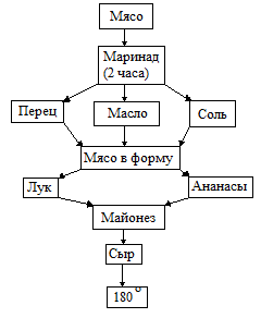 3. Технологический процессМясо отбиваете и маринуете в соке ананасов, примерно 2 часа. Намазываете форму подсолнечным маслом, мясо перчите, солите и выкладываете в форму. Сверху кладете на мясо лук (нарезанный кольцами), кусочки ананаса, поливаете майонезом и посыпаете натертым сыром. Между кусочками мяса наливаете немного сока (или воды), выпекаете в духовке при 180 градусов до готовности[3] . 4. Схема приготовления блюда «Свинина по-гавайски»