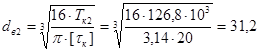 3.2 Ведомый вал: Крутящий момент на валу Т2 = 50×м. Диаметр выходного конца вала под ведущую звездочку цепной передачи определяем по пониженным напряжениям [tк ] = 20 МПа, чем учитывается влияние изгиба вала от натяжения цепи: