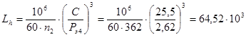 Эквивалентную нагрузку определяем для более нагруженной опоры “4”, так как R4 > R3 . Значения коэффициентов принимаем те же, что и для ведущего вала: x = 1,0,v = 1,0, Кт = 1,0, Кб = 1,2. У = 0; Определяем эквивалентную нагрузку Рэ4 = x· v· R4 · Кт · Кб = 1,0 · 1,0 · 2,18 · 1,2 · 1,0 = 2,62 кН. Расчетная долговечность, часов