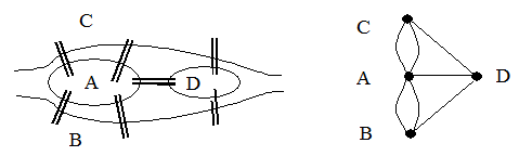 является эйлеровым циклом в графе G . Теорема доказана. Замечание. Очевидно, что приведенное доказательство будет верно и для псевдографов, содержащих петли и кратные ребра (см. рис. 1,а). Таким образом, задача о кенигсбергских мостах не имеет решения, так как соответствующий граф (см. рис. 1,б) не имеет эйлерова цикла из-за нечетности степеней все вершин.