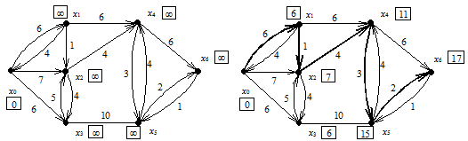 Рис. 2.1 На рис. 2.1а изображен исходный помеченный граф и начальные значения li . На рис. 2.1б для того же графа указаны конечные значения li и выделен кратчайший путь. Пометка вершин графа происходила в следующем порядке (в скобках указана дуга, вдоль которой выполняется (1)): l1 = 6 (x 0 , x 1 ), l2 = 7 (x 0 , x 2 ), l3 = 6 (x 0 , x 3 ), l4 = 12 (x 1 , x 3 ), l4 = 11 (x 2 , x 4 ), l5 = 16 (x 3 , x 4 ), l5 = 15 (x 4 , x 5 ), l6 = 18 (x 4 , x 6 ), l6 = 17 (x 5 , x 6 ). Иногда возникает задача отыскания кратчайших расстояний между всеми парами вершин. Одним из способов решения этой задачи является Алгоритм ФлойдаОбозначим lij
