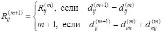 матрицу Отметим, что алгоритм Флойда непосредственно не указывает сам кратчайший путь между вершинами, а только его длину. Алгоритм Флойда можно модифицировать таким образом, чтобы можно было находить и сами пути. Для этого получим вспомогательную матрицу [Rij ], которая будет содержать наибольший номер вершины некоторого кратчайшего пути из xi в xj (Rij =0, если этот путь не содержит промежуточных вершин). Эта матрица вычисляется параллельно с