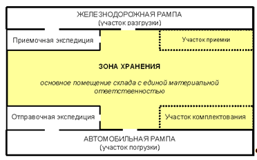 Рис.1. Принципиальная схема склада торгового предприятия Перечислим основные операции, которые выполняются на выделенных участках склада. Участок разгрузки (на рис. 1. - железнодорожная рампа): - механизированная разгрузка транспортных средств; - ручная разгрузка транспортных средств. Приемочная экспедиция (размещается в отдельном помещении склада): - приемка прибывшей в нерабочее время продукции по количеству мест и ее кратковременное хранение до передачи в основной склад. Грузы в приемочную экспедицию поступают из участка разгрузки. Участок приемки (размещается в основном помещении склада): - приемка товаров по количеству и по качеству. Грузы на участок приемки могут поступать из участка разгрузки и из приемочной экспедиции. Участок хранения (главная часть основного помещения склада): - размещение груза на хранение; - отборка груза из мест хранения. Участок комплектования (размещается в основном помещении склада): - формирование грузовых единиц, содержащих подобранный в соответствии с заказами покупателей ассортимент товаров. Отправочная экспедиция (связывает транспорт и покупателя логистическим процессом): 1. кратковременное хранение подготовленных к отправке грузовых единиц, организация их доставки покупателю. Участок погрузки (на нашей схеме – автомобильная рампа): - погрузка транспортных средств (ручная и механизированная). 1.2 Задача определения количества погрузочно-разгрузочных постов на склад ахНадежность и экономичность работы склада зависит от того, насколько правильно определено количество постов для выполнения погрузочно-разгрузочных работ. Увеличение этого количества влечет за собой рост строительных затрат и эксплуатационных расходов, сокращение – увеличивает очередь ожидающего обслуживания транспорта, т.е. увеличивает потребность в площади для парковки и маневрирования. Кроме того, ожидание разгрузки – это расходы, связанные с простоем транспортных средств. Таким образом, при определении количества постов обслуживания транспорта необходимо находить компромисс между: · размером расходов на строительство и эксплуатацию постов обслуживания транспорта; · размером суммарных расходов на строительство площадок для ожидания и маневрирования транспорта и расходов на возможный простой транспортных средств в ожидании обслуживания. В общем виде сказанное можно выразить формулой: