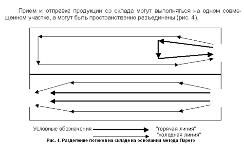 Рис. 4 В этом примере более 80% заказанных грузовых пакетов пришлось на 6 позиций ассортимента (позиции н, д, г, к, у, ю). Очевидно, что запасы по этим позициям следует разместить на «горячих» линиях. Моделирование, выполненное для условий данного примера, показало, что при размещении запаса на складе без учета скорости оборота разных позиций суммарный пробег техники при укладке на хранение и отборке возрастает в 2-3 раза. Отбор ассортимента по заказу оптовых покупателей. Операции ручной отборки и подготовки товаров к отпуску являются на складах предприятий оптовой торговли наиболее трудоемкими. Стоимость рабочей силы на участке подборки может составлять до 50% стоимости всей рабочей силы, используемой на складе. Хронометраж работы отборщика показывает, что его рабочее время в процентах распределяется приблизительно следующим образом: · отборка товара по заказу покупателей - 10%; · вынужденный простой во время пополнения запаса в зоне отборки либо во время работы в этой зоне другого отборщика - 20%; · работа с отборочными листами - 30%; · перемещение между местами отборки - 40%. Актуальность задачи сокращения времени на перемещение очевидна. Ее решение заключается в выделении на складе зоны для хранения резервного запаса и зоны для хранения отбираемого запаса. Отбираемые запасы располагают на нижних ярусах стеллажей, т.е. в доступных для осуществления операции отборки местах.