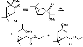 В случае цис -3-метокси-4-каранона (55 ) с экваториальной метоксигруппой наблюдается исключительно элиминирование II типа по Норришу и образование каранона 44 ; требуемое плоское шестичленное переходное состояние (ПС) А легко достижимо, и образование кетона 44 успешно конкурирует с расщеплением связи С(3)—С(4).39