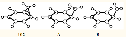 Следует отметить, что механизм сдвига не позволяет считать перегруппировку гептатриена 61 в полном смысле согласованной, ибо она протекает через дирадикальный интермедиат при температурах ~ 400°С. В процессе перегруппировки происходит перемещение циклопропановой связи, которая в исходной молекуле не является σ-связью, что тоже не позволяет считать перегруппировку сигматропной. Тем не менее довольно долго полагали, что перегруппировка триена 61 полностью отвечает правилам отбора для согласованных сигматроппых миграций алкильных групп, т.е. протекает как супраповерхностная с сохранном конфигурации мигрирующей группы. Изящные работы Клернера с соавт.102-104 полностью опровергли эти представления: заменив одну из метильных групп алкоксикарбонильной, нитрильной или алкоксиалкильной, он доказал, что перегруппировка протекает с обращением конфигурации, т.е. по "запрещенному" пути. Недавно в вышедших почти одновременно теоретических работах 105,106 это явление было объяснено на основании расчетов ab initio . В случае незамещенного норкарадиена 102 в дирадикальном ПС А запрещенного термического 1.5-алкильного сдвига метиленовая группа с неспаренным электроном находится несколько дальше от шестичленного кольца, чем в ПС В разрешенного сдвига, что понижает энергию ПС запрещенного сдвига на ~4 кДж•моль-1 (см.105 ).