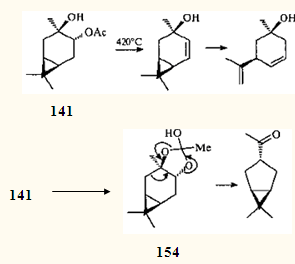 В 1966 г. было показано, что одним из продуктов дегидратации моноацетата 3β, 4α-карандиола 141 является ацетат транс -1-метил-4-изопропенилбицикло[3.1.0]гексан-2-ола (142 ).121