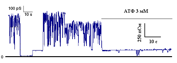 Рисунок 4. Активация УДФ целого митоКАТФ канала в нативных МХ [Mironova et al., 2004] Ранее на моделях тотальной и регионарной ишемии изолированных перфузируемых сердец крыс было показано, что уридин и УМФ проявляют антиаритмическую активность в отношении реперфузионных аритмий, предупреждают развитие миокардиального станинга при постишемической реперфузии, препятствуя депрессии сократительной функции миокарда и предотвращая развитие контрактуры [Eliseevetal., 1989]. В представленной работе была предпринята попытка определить, обладают ли уридиновые нуклеотиды кардиопротекторным действием и связано ли их влияние с активацией цито- и митоКАТФ каналов на модели искусственного острого инфаркта миокарда. 2.2 Функциональная роль митоКАТФ Являясь одним из компонентов калиевого цикла МХ, митоКАТФ участвует в поддержании объема МХ матрикса и мембранного потенциала [Garlid, 1998]. В лаборатории проф. Мироновой показано, что активация митоКАТФ играет важную роль при выходе животных из состояния зимней спячки [Fedotchevaetal., 1985; Миронова и др., 1986]. МитоКАТФ участвует также в ингибировании процесса апоптоза клетки, блокируя высвобождение цитохрома С, предотвращая снижение мембранного потенциала и чрезмерное увеличение концентрации Ca2+ , сохраняя, таким образом, функции МХ, что было показано на b-клетках поджелудочной железы [Akaoetal., 2001], а затем и на церебральных нейронах [Teshimaetal., 2003]. Кроме того, митоКАТФ является посредником в процессе регуляции транскрипции некоторых генов. Его активация вызывает небольшое увеличение продукции активных форм кислорода (АФК) [Chandeletal., 1998]. При патологии активация митоКАТФ частично востанавливает мембранный потенциал, стимулируя дальнейший перенос протонов, ингибируя накопление внутримитохондриального кальция и предотвращая распад энергетических фосфатов путем создания оптимального для синтеза АТФ электрохимического градиента [Szewczyk, 1996; Xuetal., 2001]. Активация митоКАТФ способствует разобщению электронного транспорта, ускоряя, таким образом, дыхание, что приводит к окислению проксимальных переносчиков электронов дыхательной цепи [Liuetal., 1998]. Согласно данным Гарлида, активация канала приводит к набуханию МХ, что способствует поддержанию архитектуры внутренней мембраны и сохранению активности дыхательной цепи. Это позволяет поддерживать уровень клеточного АТФ и, таким образом, способствует восстановлению функций миокарда во время реперфузии [Garlid, 2000]. Как было показано ранее, набухание матрикса увеличивает скорость окислительного метаболизма, активирует как окисление жирных кислот, так и дыхание и синтез АТФ [Halestrap, 1989]. 2.2.1 Активация митоКАТФ в развитии устойчивости организма к гипоксииВ 1983 г. был открыт феномен прерывистой гипоксии, важную роль в котором играет активация митоКАТФ [Murryetal., 1983; Liuetal., 1998]. Феномен прерывистой гипоксии был назван «preconditioning» или «ишемической толерантностью» [Murry et al., 1986; Kitigawa, 1990]. Позднее он получил название «феномен ишемической адаптации» (ФИА) [Yellon et al., 1998; Петрищев и др., 2001], и в настоящее время признан наиболее эффективным способом уменьшения размера инфаркта миокарда [Kloner et al., 1998]. Справедливости ради надо отметить, что адаптация, создаваемая кратковременной гипоксией, была обнаружена ранее [Poupa et al.,1966; Meerson et al., 1973]. Клеточные механизмы ФИА в настоящее время широко изучаются. Считается, что