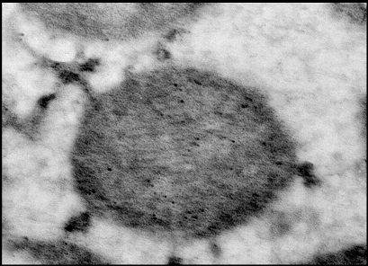 Рис.21а. Электронная микроскопия среза гепатоцита крысы. а - Срезы инкубированы с антителами к митохондриальному К+ -транспортирующему белку. Черные гранулы (указаны стрелкой) -сайты локализации К+ -транспортирующего белка с м.м. ~ 55 кДа в митохондриях.