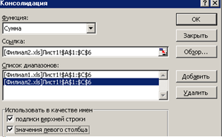 2. Выбрать команду Данные, Консолидация. 3. В поле Ссылка указать ссылку на исходный диапазон. Диапазон должен включать заголовки столбцов или строк. Если исходная книга закрыта, полный путь к ней следует указывать обязательно. Путь можно набрать или можно воспользоваться кнопкой Обзор и выбрать файл на диске: ='[Филиал1.xls]Лист1'!$А$1:$С$6 4. Нажать кнопку Добавить, ссылка будет занесена в Список диапазонов. 5. Повторить шаги 3 и 4 для всех исходных диапазонов. Если исходные рабочие листы имеют однотипные имена, достаточно будет немного отредактировать строку в поле Ссылка. ='[Филиал2.xls]Лист1'!$А$1:$С$6 6. В списке Функция выбрать тип консолидации. Для рассматриваемого примера – функция Сумма. 7. Установить флажки в группе Использовать в качестве имен. Можно установить как один флажок, так и оба Подписи верхней строки, Значения левого столбца.(рис. 7).