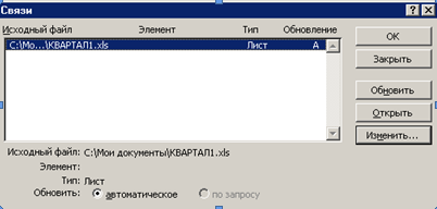 ![]() - Выделите исходный рабочий лист в списке Исходный файл. Для того чтобы выделить несколько рабочих листов, воспользуйтесь клавишей <Ctrl>. Несколько расположенных рядом рабочих листов можно выделить с помощью клавиши <Shift> и клавиш управления курсором. - Нажмите кнопку Обновить, затем нажмите кнопку Закрыть или клавишу <Esc>. Чтобы открыть выделенный исходный рабочий лист, нажмите кнопку Открыть. 1.2.5 Изменение связи с изображением ячеек Если изменилось имя исходной рабочей книга или эта рабочая книга была перемещена на новое место, или когда вы просто хотите связаться с другой рабочей книгой, необходимо изменить ссылку на внедренный рисунок. Ссылки на связанные изображения ячеек, а также другие объекты ничем не отличаются от аналогичных ссылок на ячейки и диапазоны. Увидеть ссылку на объект можно в строке формул, когда объект выделен. Там же ее можно отредактировать обычным образом. Если исходная рабочая книга закрыта в момент внесения изменений в ссылку, новое изображение ячеек не появится на рабочем листе. Видна будет только старая граница объекта. В этом случае следует обновить связь одним из способов, описанным в предыдущем разделе. Чтобы изменить все связи, установленные с одной исходной рабочей книгой, выберите команду Правка, Связи и воспользуйтесь кнопкой Изменить. Появится диалоговое окно, в котором можно будет выбрать новый файл-источник. Чтобы изменения отразились на рабочем листе, необходимо также обновить связь. Чтобы удалить связанный рисунок ячеек, выделите его и нажмите клавишу <Delete> или <BackSpace>. 1.3 Основные приемы работы со связанными книгами 1.3.1 Открытие связанных рабочих книг При открытии рабочей книги с внешними ссылками, связи могут обновляться по-разному. Если исходная рабочая книга в этот момент открыта, то связи обновляются автоматически. Если исходная рабочая книга закрыта, на экране появляется диалоговое окно с вопросом об обновляемых связях (рис. 26).