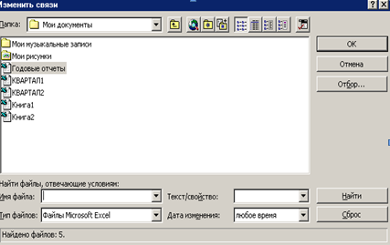 3. Выделите файлы, которые вы хотите открыть. Для закрытых в данный момент файлов указан полный путь. 4. Нажмите кнопку. Открыть. Примечание При выборе команды Правка, Связи должна быть активна целевая книга. Если активна книга, не содержащая внешних ссылок, команда будет недоступна. 1.3.2 Изменение и обновление ссылок Для поддержки системы связанных рабочих книг необходимо уметь обновлять связи. Кроме того, если исходная книга была перемещена в другую папку или диск, целевая книга не может получить данные. В этом случает говорят, что связи потеряны. Их необходимо уметь восстанавливать. Чтобы переустановить потерянные связи или установить связь с другой рабочей книгой: 1. Откройте целевую рабочую книгу. 2. Выберите команду Правка, Связи. Откроется диалоговое окно Связи. 3. Выделите файлы, связи с которыми необходимо переустановить или заменить. 4. Нажмите кнопку Изменить. Откроется диалоговое окно Изменить связи (рис. 28).