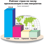 Рисунок 1 – Рейтинг стран по числу, проживающих в них мигрантов Россия стала крупнейшим центром миграции в Восточном полушарии и уступает по величине миграционных потоков только США. В Россию ежегодно прибывают более 12 млн. и одновременно выезжают около 11 млн. мигрантов. При этом гастарбайтеры ежегодно отправляют домой из России более 11,4 млрд. долл. По мнению ученых, зависимость России от труда мигрантов в ближайшие десятилетия будет нарастать, поскольку потери собственных трудовых ресурсов к 2025 году превысят 18–19 млн. человек. 1.3 Демографические, социальные и экономические аспекты миграции молодёжи молодежь миграция интеллектуальный социальный Современная молодёжь, будь-то молодежь большого мегаполиса или любого маленького городка, в последние годы предоставлена сама себе. Таковы реалии нашей нынешней жизни, в которой трудности молодежи сливаются с общими проблемами каждого человека и проблемами государства в целом. И в этом слиянии проблемы молодежи отходят как бы на задний план. Взрослые серьёзные люди с высоких трибун говорят о том, что молодежь является фундаментом нашей будущей жизни, будущим всего человечества и т.д. Жаль, что этот самый фундамент в пылу политических и финансовых баталий некому заливать и поддерживать в надлежащем состоянии. Государственные молодежные организации создаются, как правило, в тот момент, когда приближаются очередные выборы, после которых о молодежи сановные мужи очень быстро забывают, в очередной раз предоставляя возможность молодежи решать свои проблемы самостоятельно. Достойная работа для молодежи, даже для тех, кто с отличными показателями закончил престижные высшие учебные заведения, не предоставляется. Проблемы молодёжи остаются лишь её проблемами, и решать их никто не собирается[2] . Сочетание притягивающих и выталкивающих факторов, из-за которых молодёжь устремляется выехать из России, может быть весьма сложным и разнообразным, однако, в большинстве случаев основными являются демографические, социальные и экономические факторы: низкие заработки и отсутствие хорошей работы на родине, также неудовлетворенность бытовыми и жилищными условиями на родине. Велика и роль так называемых интегральных факторов, т. е. общей оценки ситуации на родине и на новом месте («отсутствие перспектив в России», «хочу жить на Западе, так как там лучше» и т. п.). По прогнозам Правительства РФ, в 2006 – 2010 гг. должен наблюдаться стабильный экономический рост (5 – 6% в год). Но каким образом можно этого добиться, учитывая резкое сокращение трудоспособного населения России? Реальным источником восполнения людских потерь могут стать миграционные процессы, которые, естественно, нельзя рассматривать вне экономической, политической и демографической ситуации. 1.3.1 Демографические аспекты миграции Демография – наука не новая. Ей уже более 300 лет, но она все еще остается малоизвестной наукой для большинства наших граждан. Правда, в последние годы положение меняется. Демографические проблемы теперь все чаще обсуждаются на заседаниях различных представительных комиссий. К сожалению, научный уровень обсуждения демографических вопросов на этих весьма важных заседаниях не всегда достаточно высок, некоторый уровень демографической образованности становится сегодня необходимым любому человеку, каким б