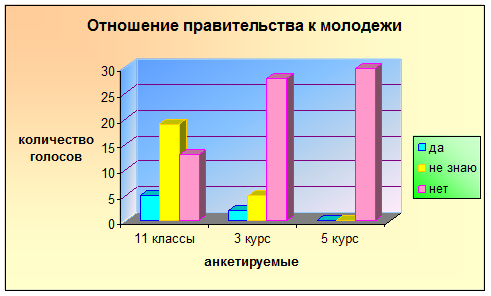 Согласно таблице 2 большинство анкетируемых предпочитают получить высшее образование на Западе. Но чем старше становится молодёжь, тем больше приоритетов она отдаёт России. На вопрос: достаточно ли правительство РФ уделяет внимание по отношению к молодежи? – выпускники ВУЗов единогласно ответили «нет», студенты 3 курсов также большое количество голосов отдали за ответ «нет», а школьники разделились во мнении за «не знаю», «нет» и «да». Это показано в диаграмме 1. Диаграмма 1 – отношение правительства к молодежи