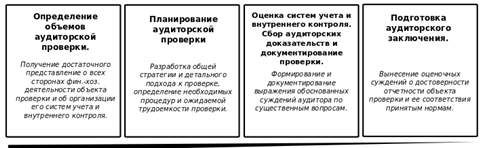 Рис. 3. Этапы аудиторской проверки и проводимые в их рамках процедуры. Объем аудиторской проверки, понятие которого определяется в п.5 ФСА №1, относится к тем аудиторским процедурам, которые считаются необходимыми для достижения цели аудита при заданных обстоятельствах и определение объема должно производиться аудитором с учетом и на основании всех действующих нормативных актов. То есть, на этапе определения объема проверки, аудитор обязан получить все необходимые данные о предмете исследования, чтобы адекватно спланировать предстоящую проверку. На этапе планирования, требования к которому устанавливаются в ФСА №3, аудитор на основании проведенного предварительного анализа обязан разработать стратегию предстоящей проверки и определить необходимые в процессе ее проведения процедуры. Также устанавливается необходимость привлечения к процессу проверки дополнительных аудиторских сотрудников и различных экспертов, определяются объемы аудиторского риска и существенности. Планирование должно способствовать выявлению всех потенциальных сложных моментов при проведении проверки, обеспечивать покрытие проверкой всех важных областей аудита, а также быть нацеленным на общую эффективность проведения процедур. На стадии планирования также должны быть предварительно намечены точки особого риска — сложные места в формировании отчетности, характеризуемые высоким числом совершаемых ошибок по различным причинам, например в силу значительной лабильности и неразъясненности нормативной базы или чрезмерным усложнением порядка принятых учетных процедур. проверка которых должна производиться с особенной тщательностью. План проведения проверки должен быть документально оформлен с надлежащим уровнем детализации. На этапе оценки систем бухгалтерского учета и внутреннего контроля проверяемого лица аудитору необходимо дать оценку вероятности возникновения ошибок, вызванных особенностями функционирования этих систем и влияющих на достоверность отчетности. Сбор аудиторских доказательств, то есть информации и результатов ее анализа, обосновывающих мнение аудитора, регулируемый ФСА №5, заключается в получении и анализе информации, на которой основывается мнение аудитора. Доказательства должны иметь надлежащий характер и быть достаточными для вынесения суждений. Надлежащий характер доказательств — их качественная сторона, определяющая совпадение с конкретной предпосылкой формирования бухгалтерской отчетности и достоверность. Следует заметить, что аудитор обыкновенно опирается на доказательства, лишь предоставляющие довод в поддержку определенного вывода и не являющиеся полностью исчерпывающими, потому сбор доказательств для подтверждения одной и той же операции производится из различных источников и документов. Документирование аудиторской проверки, производимое с учетом положений ФСА №2, подразумевает фиксирование полученных важных доказательств в рабочей документации аудитора, также освещающей информацию о планах, ходе выполнения и результатах процедур, сопряженных с ходом проведения проверки, и о выводах полученных на их основании. Документация должна составляться и систематизироваться так, чтобы наиболее полно отвечать потребностям аудитора. Все документы являются конфиденциальными и не по