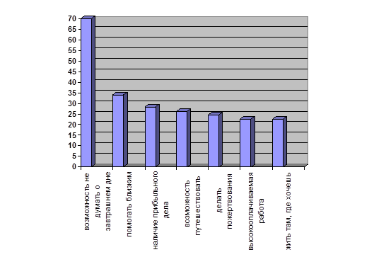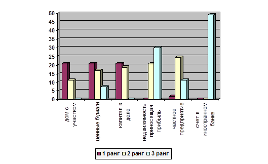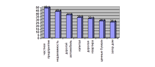 Рис. 13. Представления о предпочтениях владения Из рисунка мы видим, что в представлениях респондентов большинство окружающих людей хотели бы владеть частным предприятием и недвижимостью, чуть меньше были выбраны дорогие автомобили, капитал, квартира и ценные бумаги. Респонденты при ответе на вопрос о реально осуществимой задаче при приложении максимума усилий и реализации своих способностей отмечали следующее (см. рис. 14).