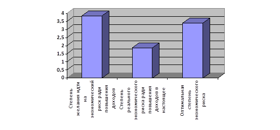 Рис.8. Средние значения показателей экономического риска При этом мы видим, что в настоящее время ради повышения доходов опрашиваемые не готовы идти на экономический риск (рис.8), а оптимальная степень готовности к риску снова имеет более высокие баллы, чем в реальности. Оценка важности уровня материального состояния друзей показала, что для большинства респондентов этот уровень абсолютно не важен (М= 1,83). Интерес к экономике нашей страны, нашего города находится в целом на среднем уровне, при этом интерес к экономике города ниже. Вместе с тем, достаточно часто отмечается просмотр СМИ об экономической ситуации в стране.