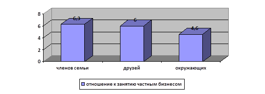 Рис.11. Ориентиры при выборе будущей профессии Как видно из рисунка 11, преобладающим ориентиром были материальные интересы, а именно возможность хорошо зарабатывать в будущем, при этом на втором месте мотив другого рода – «большой интерес к этой области», что демонстрирует не только интересы материального рода. Представления о том, как к респондентам отнеслись бы члены семьи, друзья и окружающие, займись они частным бизнесом показали следующие результаты (рис. 12).