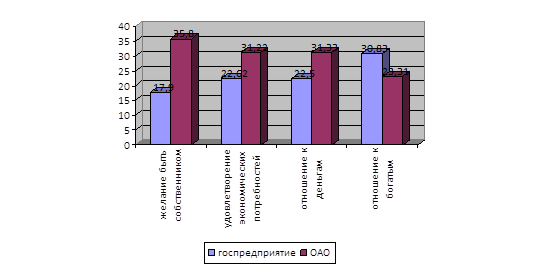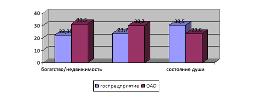 Рис. 17. Сравнительный анализ по экономико-психологическим характеристикам у сотрудников государственной и коммерческой организаций Так, достоверные различия были выявлены по показателям: -желание быть собственником, которое преобладает у сотрудников коммерческой организации; -удовлетворение экономических потребностей, так, более удовлетворены экономические потребности у сотрудников ОАО; -значимость денег и желание иметь деньги выше у представителей коммерческой компании. На уровне тенденции, можно говорить о различном отношении к богатым, так сотрудники государственного предприятия лучше относятся к богатым, чем сотрудники ОАО. Так, сотрудники коммерческой организации придают большее значение деньгам, более высоко оценивают свои возможности в повышении собственных доходов, имеют более высокий уровень желания быть собственником и хуже относятся к богатым по сравнению с сотрудниками государственного предприятия. Применяя критерий хи-квадрат (приложение 6) были выявлены следующие различия в представлениях о богатстве и бедности у сотрудников ОАО и государственного предприятия, а так же в ценностях для жизни и решении проблем.