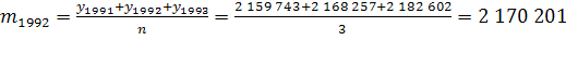 – прогнозируемый показатель; Для временного ряда показателя «Численность населения на 1 января» определим величину интервала сглаживания: n =3. Исходные данные представлены в приложении 1. Рассчитаем скользящую среднюю для первых трех периодов: