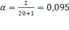 – прогнозный период; При прогнозировании данным методом возникает два затруднения: 1) выбор значения параметра сглаживания α ; 2) определение начального значения U о . От величины α будет зависеть, как быстро снижается вес влияния предшествующих наблюдений. Чем больше α , тем меньше сказывается влияние предшествующих лет. Если значение α близко к единице, то это приводит к учету при прогнозе в основном влияния лишь последних наблюдений; если близко к нулю, то веса, по которым взвешиваются уровни временного ряда, убывают медленно, т.е. при прогнозе учитываются все (или почти все) прошлые наблюдения. Таким образом, если есть уверенность, что начальные условия, на основании которых разрабатывается прогноз, достоверны, следует использовать небольшую величину параметра сглаживания (α→0). Когда параметр сглаживания мал, то исследуемая функция ведет себя как средняя из большого числа прошлых уровней. Если нет достаточной уверенности в начальных условиях прогнозирования, то следует использовать большую величину α, что приведет к учету при прогнозе в основном влияния последних наблюдений. Точного метода для выбора оптимальной величины параметра сглаживания α нет. В отдельных случаях автор данного метода профессор Браун предлагал определять величину α, исходя из длины интервала сглаживания. При этом α вычисляется по формуле: