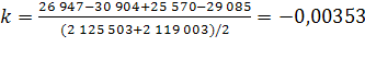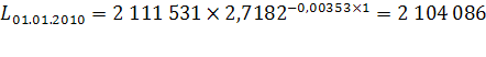 где где M - число родившихся за период; N – число умерших за период; П - число прибывших за период; В – число выбывших за период; S – средняя численность населения за период; t- период, на который разрабатывается прогноз. Согласно имеющимся данным, численность населения Оренбургской области на 1 января 2008 года составила 2 119 003 чел., на 1 января 2009 – 2 111 531 чел., за 2008 год родилось 26 947 чел., умерло 30 904 чел., 25 570 чел. прибыло и 29 085 чел. выбыло. Рассчитаем численность населения в 2010-2012 гг. при условии, что коэффициент общего прироста населения (