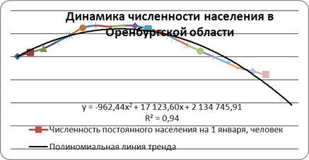 Рис. 2. Динамика численности населения в Оренбургской области с полиномиальной линией тренда. При использовании уравнения полинома третьей степени, коэффициент аппроксимации увеличивается до 0,97, но при этом усложняется и сама модель, что может отрицательно сказаться на ее прогностических возможностях. Уравнение регрессии примет вид:
