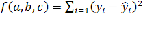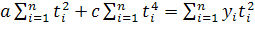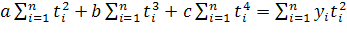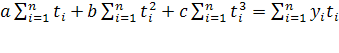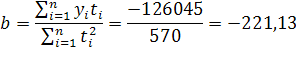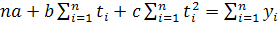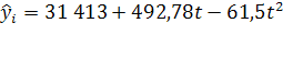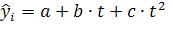 Параметры a , b и c оцениваются методом наименьших квадратов и отвечают принципу максимального правдоподобия: сумма квадратов отклонений фактических уровней от тренда (от выровненных по уравнению тренда уровней) должна быть минимальной для данного типа уравнения. На диаграмме уравнение тренда имеет вид: При этом нумерация периодов начинается с t