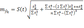 Полученное прогнозное значение является точечным и не учитывает колеблемость уровней показателя. При прогнозе с учетом случайной колеблемости учитывается как вызванная колеблемостью ошибка репрезентативности выборочной оценки тренда, так и колебания уровней в отдельные периоды (моменты) относительно тренда. Общая формула средней ошибки прогноза положения параболического тренда на период с номером