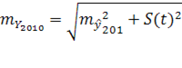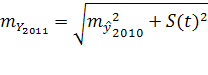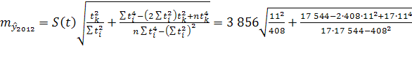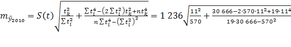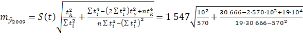 с вероятностью 95% можно утверждать, что тренд численности населения в Оренбургской области в 2010 году проходит в границах 2 069 907±13 307 или от 2 056 600 до 2 083 214 человек. Определив ошибку репрезентативности выборочной оценки тренда, и колебания уровней в отдельные периоды (моменты) относительно тренда, получаем единую формулу средней ошибки прогноза конкретного отдельного уровня: