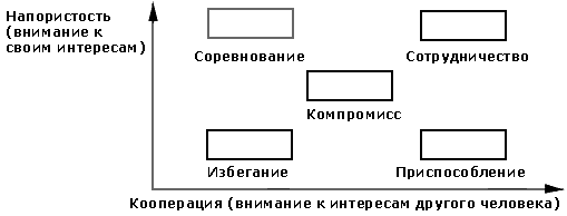 Рис. 2. Пять способов урегулирования конфликтов В опроснике описывается каждый из пяти перечисленных вариантов двенадцатью суждениями о поведении человека в конфликтной ситуации. В различных ситуациях они сгруппированы в 30 пар, в каждой из которых испытуемому предлагается выбрать то суждение, которое является наиболее типичным для характеристики его поведения. Инструкция. Предлагаемый тест имеет целью определить характерную для Вас тактику поведения в конфликтных ситуациях. Он состоит из 30 пунктов, в каждом из которых имеется два суждения, обозначенные буквами А и Б (они иногда повторяются в разных пунктах). Сравнивая указанные в пункте два суждения, каждый раз выбирайте из них то, которое является более типичным для Вашего поведения. В бланке для ответов под номером пункта поставьте А или Б в соответствии с Вашим выбором. Количество баллов, набранных испытуемым по каждой шкале, дает представление о выраженности у него тенденции к проявлению соответствующих форм поведения в конфликтных ситуациях. Текст опросника см. Приложение 8. 2.3 Результаты исследования1. Результаты диагностики манипулятивного отношения (по шкале Банта) см. Приложение 9, табл. 3 и рис. 3. При диагностике показателя манипулятивного отношения у четырех человек (16%) обнаружен низкий показатель манипулятивного отношения, у семерых (28%) - средний показатель с тенденцией к низкому, у девяти (36%) – средний показатель с тенденцией к высокому, у пятерых (20%) – высокий показатель манипулятивного отношения.