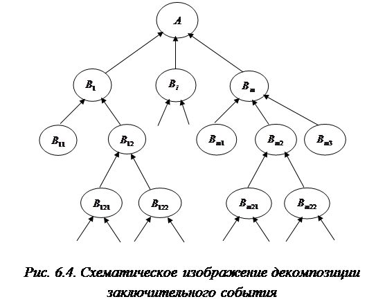 В. Сложные экспертизы. Метод дерева целейСложные экспертизы находят широкое применение при прогнозировании и планировании в экономике, политике, широкомасштабных научных исследованиях и т.п. Как правило, они не дают прямых указаний о предпочтительности выбора того или иного решения и не оценивают последствия различных решений. Главным предназначением сложных экспертиз является оценка осуществимости тех или иных явлений и событий, а также определение их вероятных сроков и последовательности свершения. Располагая информацией такого рода, ЛПР может найти решения, способствующие (или – при необходимости – препятствующие) появлению анализируемых событий. Вследствие чрезвычайной сложности исследуемых явлений и – как правило – их значительной удаленности во времени от проводимой экспертизы, намного более корректно говорить о вероятностях (шансах) реализации того или другого явления, а не о конкретных сроках его реализации. Следует отметить, что к строгому математическому понятию вероятности экспертные оценки такого рода можно отнести лишь условно, т.к. речь идет не о массовых событиях, а, как правило, об уникальных. В связи с этим указанные экспертные оценки получили название интуитивных вероятностей. Интуитивные вероятности представляют собой своеобразную форму нечеткого представления экспертных оценок сложных ситуаций. Следует отметить, что нестрогость понятия интуитивной вероятности не означает ее “неполноценности” и ее использование дает результаты, хорошо согласующиеся с реальностью. Исчисление интуитивных вероятностей проводится по используемым в теории вероятностей правилам. Использование экспертами интуитивных вероятностей вызывает необходимость формулировки самих вопросов в вероятностном смысле. Например, вместо вопроса “Когда произойдет событие?”, следует задать вопрос “Какова вероятность того, что событие произойдет до какого-то момента времени?”. Следует отметить, что часто даже в данной постановке эксперт или эксперты не в состоянии дать достаточно обоснованный ответ. В таких случаях проводят декомпозицию (расчленение) анализируемых явлений и событий на более простые, оценка которых не столь сложна. Далее обрабатывают полученные от экспертов оценки и на ее основе пытаются ответить на вопрос. Таким образом, в основе сложных экспертиз лежит декомпозиция исходной сложной проблемы на составляющие, проведение по ним совокупности простых экспертиз с последующей обработкой полученных экспертных оценок. В настоящее время существует несколько типов сложных экспертиз, например, метод дерева целей, метод решающих матриц, метод “Дельфи” и ряд других. Мы ограничимся рассмотрением сложной экспертизы “Метод дерева целей”. Исследуемое событие обозначим как Как правило, события Полученные в результате декомпозиции исходного события результаты представляют графически, причем события изображаются кружками, а связи между событиями – стрелками. В результате получается граф событий (Рис.6.4), по виду напоминающий перевернутое дерево (отсюда – дерево целей).