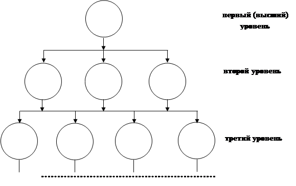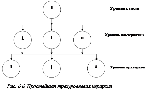 Действуя аналогичным образом, можно выразить все остальные вероятности событий первого уровня через вероятности связанных с ними событий второго уровня. Вычисления производятся до тех пор, пока вероятность Помимо вероятностных характеристик событий с помощью дерева целей могут быть оценены временные затраты, стоимостные и другие показатели реализации соответствующих событию Достоинством метода дерева целей является наглядность взаимосвязей между составляющими исследуемой сложной проблемы. Для реализации экспертизы необходимо привлекать большое число экспертов различных специальностей. Поэтому деятельность соответствующих экспертных групп должна быть надлежащим образом организована. С этой целью по указанию ЛПР создается специальная экспертная группа со следующими функциями: · Осуществление предварительного анализа сложной проблемы и декомпозиция проблемы на составляющие; · Формирование экспертных групп для уточнения первоначального варианта расчленения, формулировки вопросов для экспертов и определения методики проведения простых экспертиз по каждому из вопросов; · Определение первоначального состава экспертных групп для проведения всех простых экспертиз; · Проведение совокупности простых экспертиз; · Предварительный анализ экспертных оценок и проведение в случае необходимости дополнительных туров экспертного оценивания; · Обработка результатов и выработка рекомендаций для ЛПР. Г. Метод анализа иерархий (МАИ)Метод анализа иерархий, разработанный под руководством американского специалиста по исследованию операций Т.Саати, применяется в настоящее время при решении самых разнообразных проблем, среди которых, в частности: · проектирование транспортных систем крупных городов; · разработка планов обеспечения энергетическими ресурсами отраслей промышленности; · оценка сценария развития высшего образования; · определение приоритетных направлений научных исследований; · прогнозирование цен на различную продукцию; · планирование развития фирм; · аттестация персонала учреждений и предприятий; · решение эколого-экономических проблем регионов; · проектирование сложных технических систем. Развитие идеи декомпозиции приводит к необходимости разработки и освоения такой концепции исследования сложных проблем, которая базировалась бы на их структурировании, упорядочении конкурирующих решений на основе оценки степени влияния всех выявленных структурных элементов: показателей эффективности, ограничений, возможных решений и т.п. Эта концепция должна органически включать человека в процесс исследования, учитывать в возможно более полном объеме роль человеческого фактора, примирять многочисленные и подчас противоречивые устремления людей, чьи интересы затрагивают те или иные решения. В общем случае иерархия определяет расположение некоторых объектов (элементов иерархии) в порядке от высшего к низшему, от старшего к младшему по степени подчиненности. Существуют различные разновидности иерархий. Простейшими и наиболее распространенными являются доминантные иерархии, схематически изображаемые в виде древовидной структуры (Рис.6.5). Рассмотренное ранее дерево целей (Рис.6.4) представляет собой доминантную иерархию, элементы которой являются составляющими событиями, связанными со вспомога