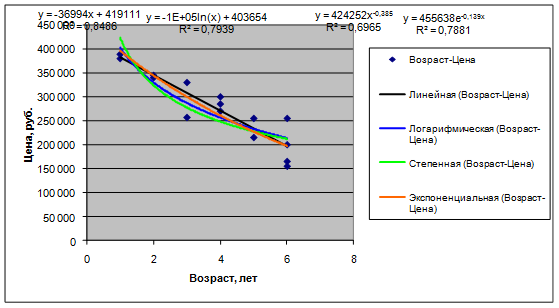 Оценщик, проанализировав полученные данные, предположил, что цена в рамках одной модели зависит в первую очередь от его возраста и пробега. Результат анализа влияния этих факторов может позволить с удовлетворительной точностью определить зависимость цены от этих параметров и, в конечном итоге, наиболее вероятную стоимость объекта оценки. 9.2.1 Определение стоимости автомобиля на основе анализа влияния фактора «возраст»Далее была построена регрессионная модель, отражающая влияние фактора-признака «возраст» на стоимость. Затем, на основании полученной регрессионной модели было определено значение результирующего признака («стоимость автомобиля») для объекта оценки.