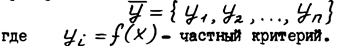 Здесь и далее предполагается, что все частные критерии надо минимизировать. Для поиска Х ÎР используется два подхода: - векторный критерий У преобразует (сворачивают) в обобщенный скалярный критерий Yc а затем применяют известные однокритериальныеметоды оптимизации (линейное, нелинейное, стохастическое программирование и т.п.) ; - применяют специальные методы многокритериальной оптимизации непосредственно по векторному критерию У . . Рассмотрим некоторые способы свертки. Наиболее простой способ - взвешенное линейное суммирование частных критериев . где a- коэффициент важности (вес) частного критерия Yi . . Для определения значений коэффициентов применяют экспертные методы. Использовать линейную свертку суммированием нельзя, если существует нелинейная зависимость частных критериев между собой. Если один из частных критериев намного важнее остальных, для которых известныих предельно допустимые значения bi , то оптимизация производится по наиболее важному (главному) критерию Ус=Yi а для остальных критериев устанавливаются ограничения:
