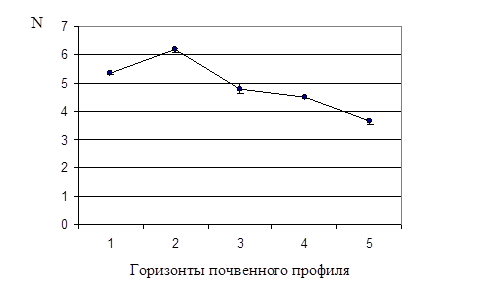 Рис. 1. Динамика общей численности бактерий в почвенном профиле дерновой альфегумусовой глеевой почвы. N – численность бактерий (× 109 кл/г почвы). Как видно из табл. 1 и рис. 1, максимальное значение общей численности бактерий (Nобщ. )– 6,2×109 кл/г – наблюдали во втором горизонте, по сравнению с остальными четырьмя горизонтами. Этот факт можно объяснить тем, что два верхних горизонта исследуемой почвы обладают хорошей проницаемостью для воды и поступающего с ней органического вещества. Третий горизонт почвенного профиля уже более уплотнен, поэтому органическое вещество, накапливаясь во втором горизонте, является фактором, стимулирующим развитие в нем почвенных микроорганизмов. Данные табл. 1 показывают, что Nобщ. достоверно снижалась с увеличением глубины залегания почвенного горизонта: от второго к пятому, самому нижнему. Полученный результат согласуется с тем фактом, что содержание органического вещества, необходимого для развития почвенных микроорганизмов, также снижается с увеличением глубины залегания горизонта. При переходе от верхнего горизонта к нижележащим изменяются также окислительно-восстановительные условия, pH и др. Порядок величин Nобщ. в каждом горизонте был одинаков – 109 кл/г. По-видимому, в верхних более рыхлых горизонтах, куда поступает достаточное количество кислорода с поверхности, создались оптимальные условия для развития аэробных микроорганизмов. В нижележащих горизонтах содержание кислорода минимально, и прежний порядок значения Nобщ. объясняется активным развитием анаэробов. Численность сапротрофных бактерий (Nсапр. ) уменьшалась от первого горизонта к третьему, причем резкое снижение численности – более чем в 6 раз – было отмечено при переходе от первого ко второму горизонту (рис. 2А). Nсапр. (таб.2) в четвертом горизонте – 4,5×104 кл/г – была незначительно выше, по сравнению с третьим – 2,0×104 кл/г, – тогда как в пятом она опять понижалось до значения, отмеченного в третьем горизонте (рис. 2А). Как показано на рис. 2Б, численность олиготрофных бактерий (Nолиг. ) последовательно снижалась с увеличением глубины залегания почвенного горизонта от 9,5×107 в первом до 1,5×107 кл/г в пятом горизонте (таб.2).