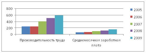 Рис. 4 Соотношение темпов роста заработной платы и производительности труда ГУЗ «Областной кожно-венерологический диспансер» за 2005 – 2009 гг. В то же время средняя заработная плата работника за месяц составила в 2005 г. – 5,2 тыс. руб., в 2006 г. – 6,5 тыс. руб., в 2007 г. – 9,2 тыс. руб., в 2008 г. – 10,85 тыс. руб., а в 2009 г. – 15,1 тыс.руб. Среднемесячная заработная плата также обнаруживает тенденцию к росту, причем темпы роста производительности труда несколько ниже темпов роста заработной платы, что свидетельствует о преобладании экстенсивного типа развития. Графически соотношение темпов роста заработной платы и производительности труда ГУЗ «Областной кожно-венерологический диспансер» за 2005 – 2009 гг. представлена на рис. 4 Основные фонды – это часть медицинского оборудования, которая вещественно воплощена в средствах труда, сохраняет в течение длительного времени свою натуральную форму, переносит по частям стоимость на продукцию и возмещается только после проведения нескольких производственных циклов. Для характеристики эффективности использования основных средств ГУЗ «Областной кожно-венерологический диспансер» составим таблицу 2 Таблица 2 Анализ показателей эффективности использования основных средств ГУЗ «Областной кожно-венерологический диспансер» за 2005 - 2009 гг.