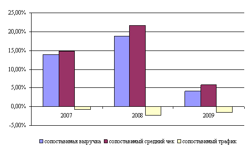 Рисунок 2 - Количество SKU и доля в объеме продаж за 2003-2009 г. В 2009 году Компания открыла распределительный центр в Тольятти. Открытие логистического комплекса повысил качество сервиса в Приволжском регионе. Общая площадь 9 распределительных центров на 31 декабря 2009 года составила 185 537 кв.м. В отчетном году автопарк Компании увеличился на 288 грузовых автомобилей, общее количество единиц составило 1 453, что позволило значительно сократить транспортные издержки. В 2009 году Компания увеличила объем товаров, доставляемых через распределительные центры, до 78% с 72% в 2008 году, что также является драйвером роста валовой маржи. Компания активно работала с персоналом, повышая лояльность своих сотрудников и развивая корпоративную культуру. В 2009 году среднесписочное количество сотрудников Компании составило 75 745, из которых 58 606 – это персонал магазинов, 10 638 заняты в логистической составляющей Компании, 4 419 работают в филиалах, 2 082 – сотрудники Головной Компании. Средняя заработная плата по Компании в 2009 году составила 13 714 руб. Утвержденное 23 декабря 2009 года Советом Директоров ОАО «Магнит» Положение о Программе по премированию и Комитете при Генеральном директоре по кадрам и вознаграждениям ЗАО «Тандер» направлено на дополнительную мотивацию ключевого персонала, обеспечивающего высокие темпы развития Компании. Максимальный объем программы за 2009 год составила 147 357 акций Компании (количество бумаг, общая стоимость которых на дату принятия решения не превышает 7% от чистой прибыли Компании по МСФО за 2008 год). Реализация текущего этапа программы будет завершена в 2011 году. Участниками данной программы могут стать сотрудники, проработавшие в Компании не менее 8 лет, в том числе не менее 2 лет на должности не ниже начальника отдела, а также ключевые сотрудники, деятельность которых обеспечивает высокие темпы роста Компании. В 2009 Компания продолжила активно работать с покупателями и развивать маркетинговую программу. Тем не менее, сокращение доходов населения отразилось на показателях сопоставимой выручки, среднего чека и трафика. Рост сопоставимых продаж 2009 года к 2008 году в рублевом выражении составил 4,1% и был обусловлен ростом сопоставимого среднего чека на 5,8%, в то время как трафик имел отрицательное значение в -1,5%.