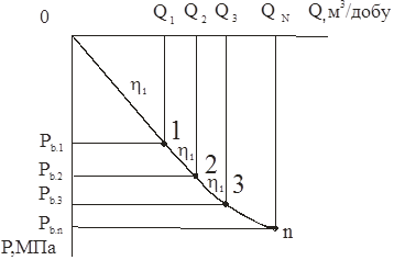 Вгнуті форми індикаторних кривих можуть бути отримані при дослідженні покладів, складених пластами різної проникності і зв'язані з під'єднанням або від'єднанням окремих пластів при зміні депресії у свердловині. При збільшенні і наступному зменшенні депресії (прямий і зворотний хід зміни режиму фільтрації) спостерігається різний характер зміни таких діаграм, так як при зворотному ході точки в координатах Q=f(Pв ) можуть накладатися або не накладатися на індикаторну діаграму прямого ходу Зворотна індикаторна діаграма (якщо при зворотному ході спостерігається накладання точок) викликається більш складними процесами,, залежними від фізичних властивостей пластів і наповнюючих їх рідин. Методика обробки таких діаграм, запропонована В.Є.Колбіковим, з деякими змінами, введеними в УкрНДГРІ, викладена нижче: а) будується індикаторна крива в координатах Q=f(Pв ), початок координат відповідає нульовому дебіту (вісь абсцис) і пластовому тиску(вісь ординат) (рис. 2.2); б) всі точки індикаторної кривої, отримані в результаті досліджень, з'єднуються ламаною лінією, при цьому перший відрізок (0 - 1) характерезує продуктивність першого пласта (або групи пластів) з працюючого інтервалу; наступний відрізок (1-2) характерезує продуктивність першого і другого під'єднаних пластів; відрізок (2 - 3) характеризує продуктивність перших двох і третього під'єднаного пласта і т.д.
