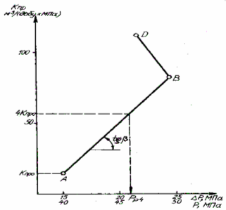 і тангенсна кута tgb = DКпр /DР, кривих зміни коефіцієнта приймальності до осі тисків Кпр =f(Р), за умовноъ лінеаризації цієї залежності. Типову картину зміни коефіцієнта приймальності від тиску наведено на рис.3.2.2. точка А відповідає приймальності Кпр.0 при витраті q0 і тиску Р0 ; точка В – при Р=РР max ; точка в – при Кпр =Кпр. max