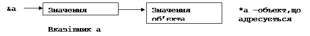 Вираз &a дозволяє одержати адресу ділянки пам'яті, виділеного змінній а. Операція & застосовна тільки до об'єктів, що мають ім'я і розміщених у пам'яті. Маючи можливість визначити адреси змінної за допомогою &, треба мати можливість працювати з цією адресою: зберігати його, передавати, перетворювати. Для цього вводиться поняття вказівника. Вказівник - це змінна, значенням якої служить адреса об'єкта конкретного типу. Нульова адреса позначається константою NULL, що визначена в заголовному файлі stdio.h. Щоб визначити вказівник треба повідомити на об'єкт якого типу посилається цей вказівник. char *z; int *k,*i; float *f; * - це операція разіменування. Операндом цієї операції завжди є вказівник. Результат операції - це той об'єкт, що адресує вказівник_операнд.